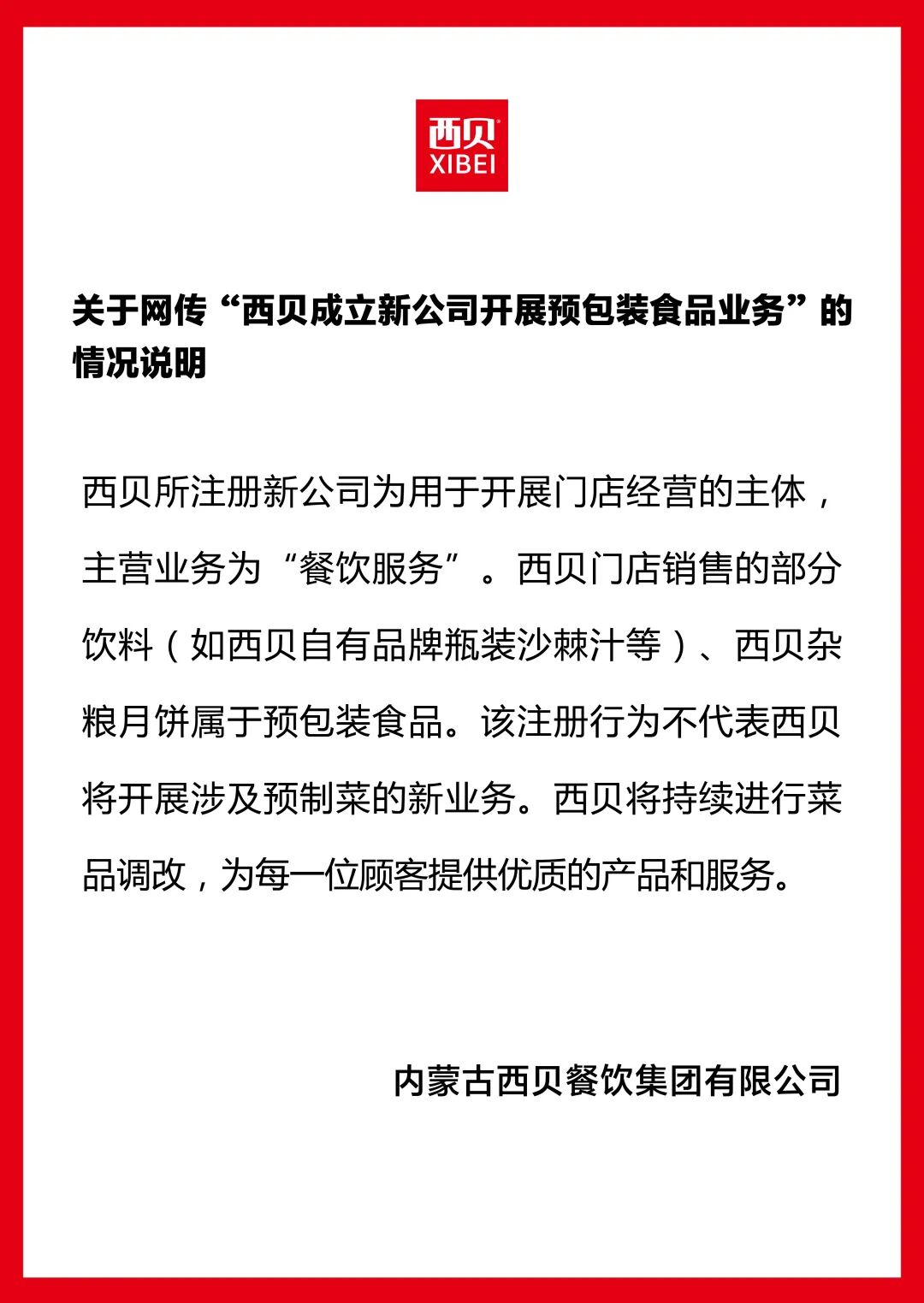 之后,西贝方面回应称,西贝所注册新公司为用于开展门店经营的主体,主营业务为“餐饮服务”。西贝门店销售的部分饮料(如西贝自有品牌瓶装沙棘汁等)、西贝杂粮月饼属于预包装食品。该注册行为不代表西贝将开展涉及预制菜的新业务。